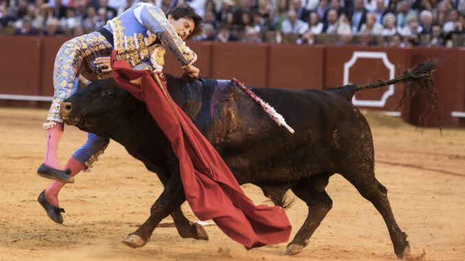 Sevilla (España).- El diestro peruano Andrés Roca Rey ha sufrido una cornada en la cara interna del muslo derecho, al entrar a matar en la corrida celebrada en la plaza de la Maestranza de Sevilla, durante la Feria de Abril.