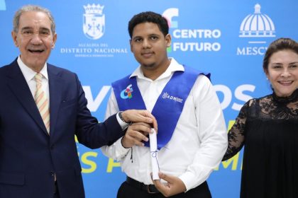 Franklin García Fermín con estudiante graduado y Carolina Mejía (Foto: MESCYT) EL NUEVO DIARIO, SANTO DOMINGO. – Un total de 41 estudiantes concluyeron el martes el programa inglés por Inmersión impar...