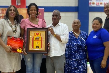 Roberto Ramírez, presidente de Fedoclubes, entrega a Sugey Monsac, la franela enmarcada No. 15, que retiró las Águilas de Guachupita. Figuran, desde la izquierda, Alba Galván, Niurka Herrera, Lucía Ma...