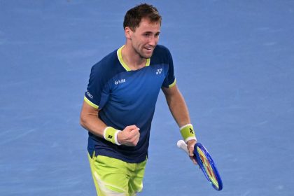 El noruego Casper Ruud celebra tras vencer al croata Marin Cilic en su partido individual masculino en el séptimo día del torneo de tenis Abierto de Australia en Melbourne el 24 de enero de 2026. (Fot...
