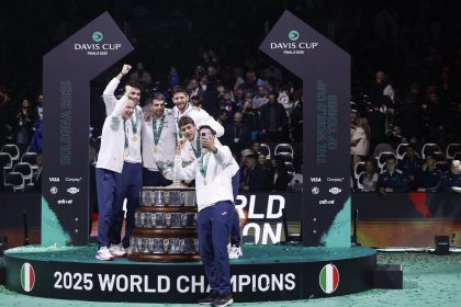 El equipo de tenis de Italia celebra tras ganar la final de la Copa Davis 2025 en el Centro de Exposiciones Fiere en Bolonia, Italia, el 23 de noviembre de 2025. (Tenis, Italia) EFE/EPA/SERENA CAMPANI...