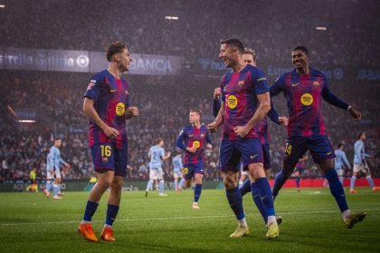 Robert Lewandowski celebra junto a sus compañeros en el Barcelona. Foto fcbarcelona.es EL NUEVO DIARIO, VIGO.- El FC Barcelona no falló en Balaídos, donde exhibió su pegada, con un triplete de Robert ...