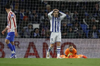 El centrocampista de la Real Sociedad Carlos Soler se lamenta tras una ocasión fallada durante el partido de LaLiga que Real Sociedad y Atlético de Madrid disputan en el estadio de Anoeta. EFE/Juan He...