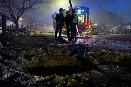 Agentes de las fuerzas del orden ucranianas se encuentran junto a un cráter en el lugar de un ataque aéreo en Zaporizhzhia, el 20 de noviembre de 2025, en el contexto de la invasión rusa de Ucrania. (...