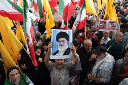 Un iraní sostiene un retrato del líder supremo iraní, el ayatolá Alí Jamenei, entre banderas nacionales de Irán durante una manifestación en Teherán tras el alto el fuego con Israel. EFE/Abedin Taherk...