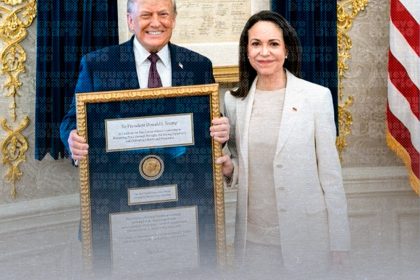 Donald Trump mientras sostiene la placa de Premio Nobel de la Paz entregado por María Corina Machado. Arte/El Nuevo Diario Leer resumen de la noticia (IA) CLICK AQUÍ Analizando noticia… por favo...