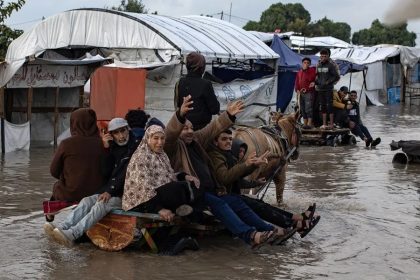 Una familia palestina en una calle inundada por las lluvia en Jan Yunis, en el sur de Gaza, el pasado mes de diciembre. EFE/EPA/Haitham Imad JERUSALÉN.- El portavoz de Hamás en Gaza, Hazem Qasim, lame...