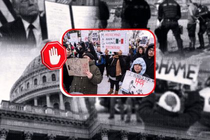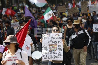 Entre banderas venezolanas y mexicanas, los participantes de diversas organizaciones levantaron sus pancartas con mensajes como “Gringo fuera de Latinoamérica” y “Respeto a la soberanía de México”, en...