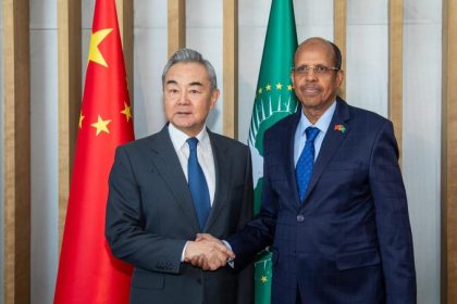 El presidente de la Comisión de la UA, Mahmoud Ali Youssouf, se reunió con el máximo diplomático chino, Wang Yi, en la sede de la UA en Adís Abeba. Foto: African Institute for Belt and Road @AfricanIB...