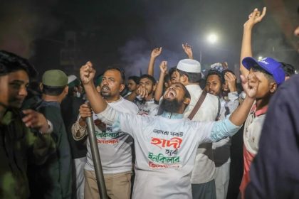 Manifestantes gritan consignas en la intersección de Shahbagh en Dhaka, Bangladesh. EFE/ Monirul Alam NUEVA DELHI.- Las autoridades de Bangladés han desplegado este viernes un dispositivo de seguridad...