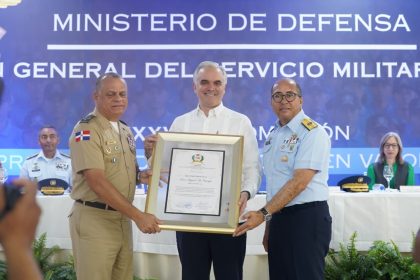 La placa fue entregada por el ministro de Defensa y el director general del Servicio Militar Voluntario a Luis Miguel De Camps. (Foto: Minerd) Leer resumen de la noticia (IA) CLICK AQUÍ Analizando not...