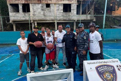Steward “Kosovo” Berroa, a la izquierda con gorra de las Águilas Cibaeñas, junto al General Jacobo Mateo Moquete, Director Deportes de la Policía, mientras entregan útiles de béisbol, fútbol y balonce...