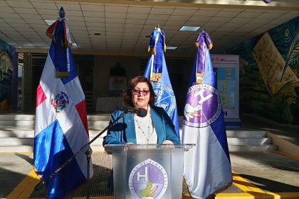 La directora de la Escuela de Letras de la Facultad de Humanidades de la; UASD, maestra Ruth Cuevas de dirige a los presentes en la ofrenda floral en el busto de Pedro Henríquez Ureña. (Foto: UASD) EL...
