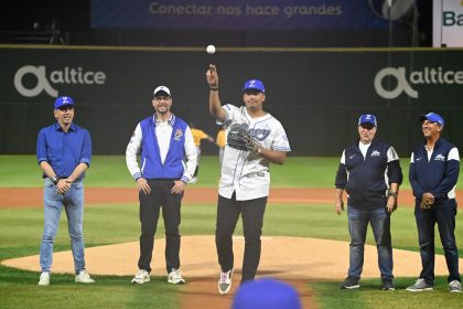 El receptor de los Orioles de Baltimore, Samuel Basallo, fue el encargado de realizar el lanzamiento ceremonial de la primera bola este viernes entre Águilas y Licey. Foto prensa Licey. EL NUEVO DIARI...